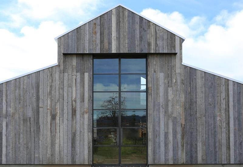 Towering 14 foot-tall steel entryway French doors make quite the first impression as you enter this modern barn-style estate. Guiding the eye up, the custom steel entryway door pair amplifies the barn’s high vaulted ceilings and give the feeling of openness. The specialized blackened steel patina finish highlights the rustic raw charm of the salvaged wood siding, and sleek metal roof.
