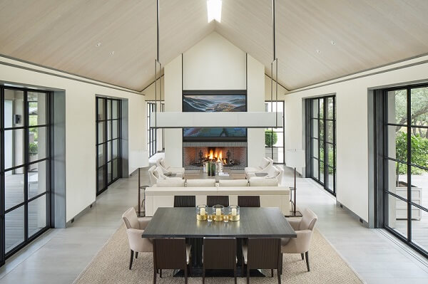 This ultra-luxe modern wine country estate made use of multiple steel pocketing sliders to create a truly open concept design that seamlessly embraces the surrounding vineyards. The strategic placement of the steel pocketing sliders give the home a balanced symmetric appearance, and allows for beneficial cross ventilation in warmer summer months.