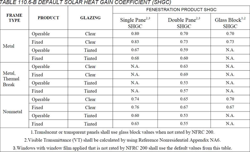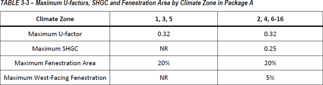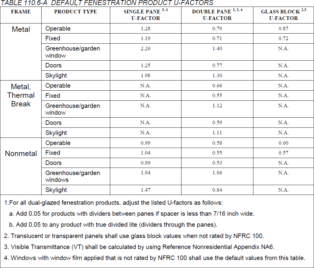 The following tables reflect the 2019 Building Energy Efficiency Standards mandatory requirements for fenestration products and exterior doors: